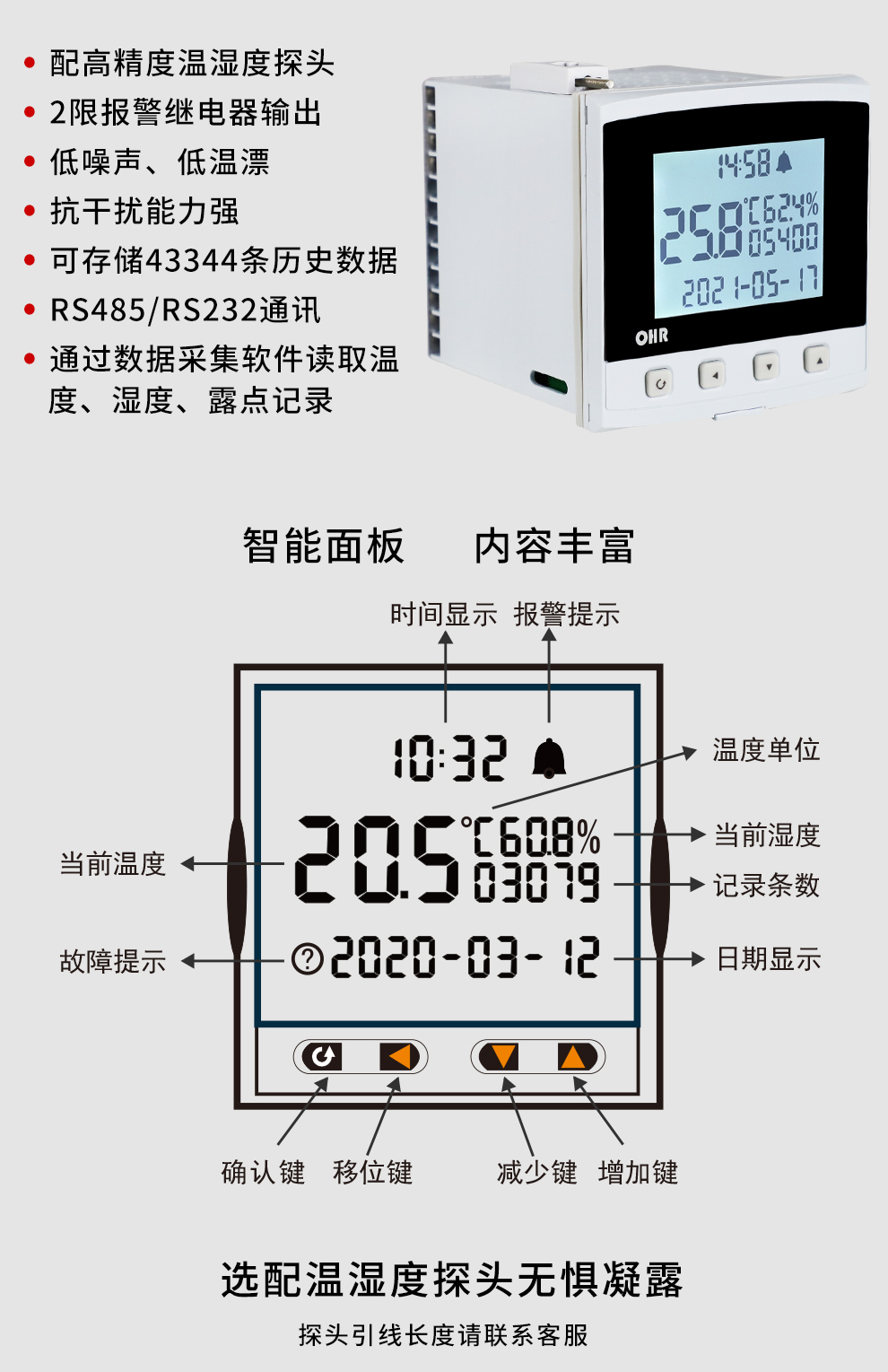 OHR-WS40R系列盤裝式溫濕度記錄儀采用高精度的采集電路及進口傳感器,對環(huán)境的溫濕度進行實時監(jiān)測、報警與記錄。大屏幕液晶顯示器,實時顯示溫濕度、時間與記錄信息;帶串行通訊接口,實現(xiàn)數(shù)據(jù)通訊;通過配套的上位機軟件可查看數(shù)據(jù)詳情。該記錄儀主要用于監(jiān)測記錄食品、醫(yī)藥品、化學(xué)用品等產(chǎn)品在存儲過程中的溫濕度數(shù)據(jù),廣泛應(yīng)用于倉儲、冷藏庫、實驗室、養(yǎng)殖孵化、大棚種植等。