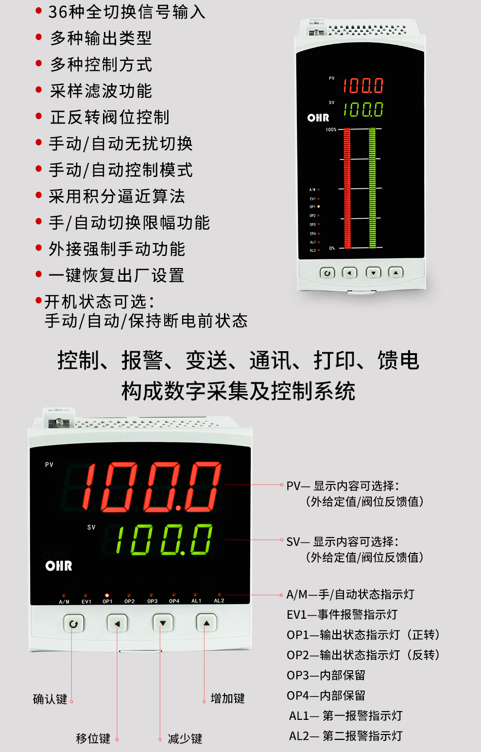 同時按,儀表面板燈 A/M長亮時為手動SV屏顯示的數(shù)值可由0.0-100.0%可調(diào),反之滅為自動。