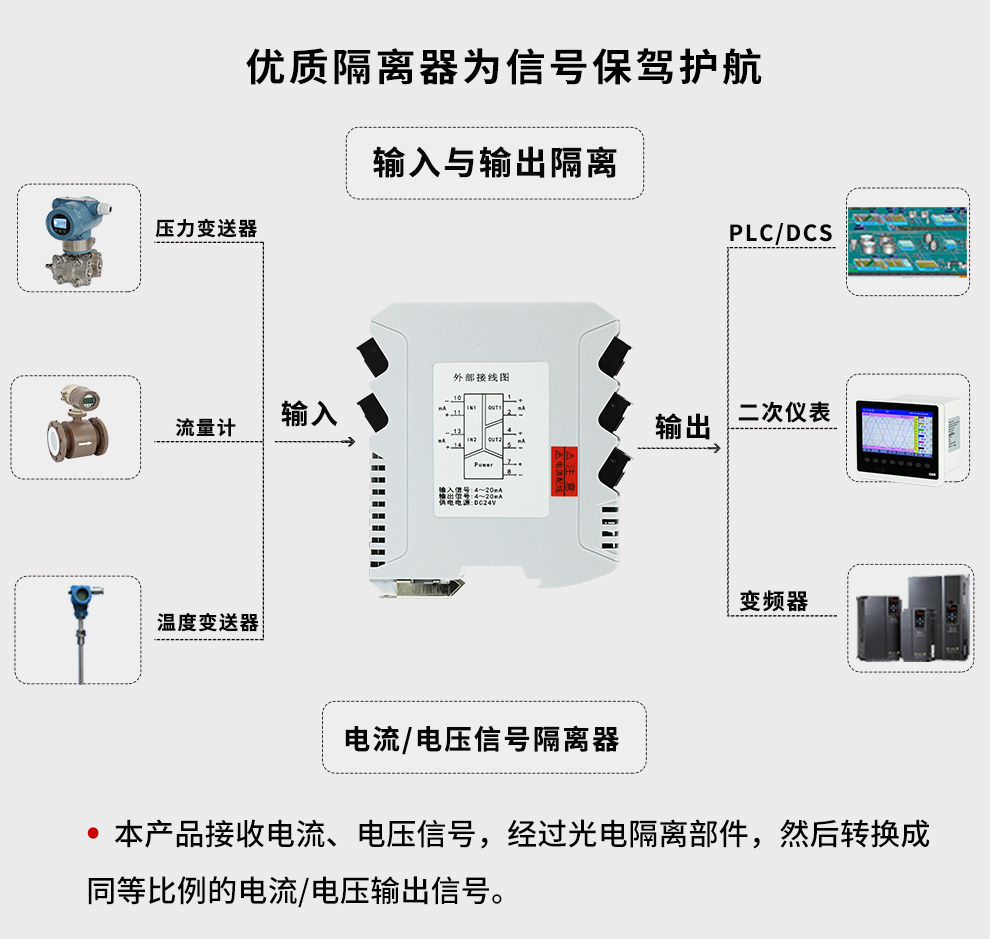 OHR-M31系列智能隔離器將直流電壓或電流信號(hào)經(jīng)過(guò)隔離傳送,轉(zhuǎn)換成所需的信號(hào)給其它儀表??梢耘c單元組合儀表及DCS、PLC等系統(tǒng)配套使用,給予現(xiàn)場(chǎng)儀表信號(hào)隔離、信號(hào)轉(zhuǎn)換、信號(hào)分配、信號(hào)處理等,從而提高工業(yè)生產(chǎn)過(guò)程自動(dòng)控制系統(tǒng)的抗干擾能力,保證系統(tǒng)的穩(wěn)定性和可靠性。