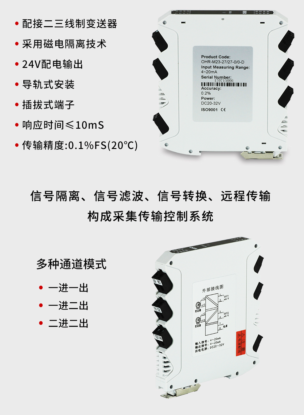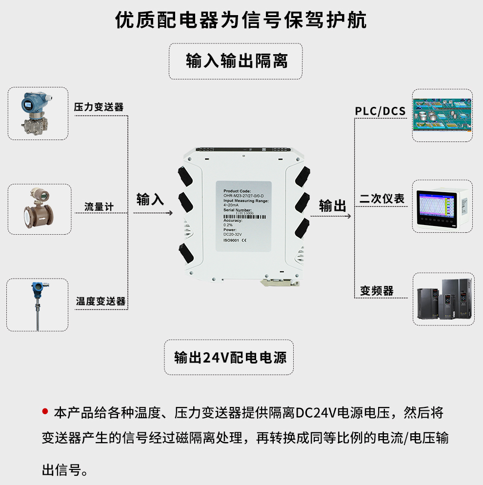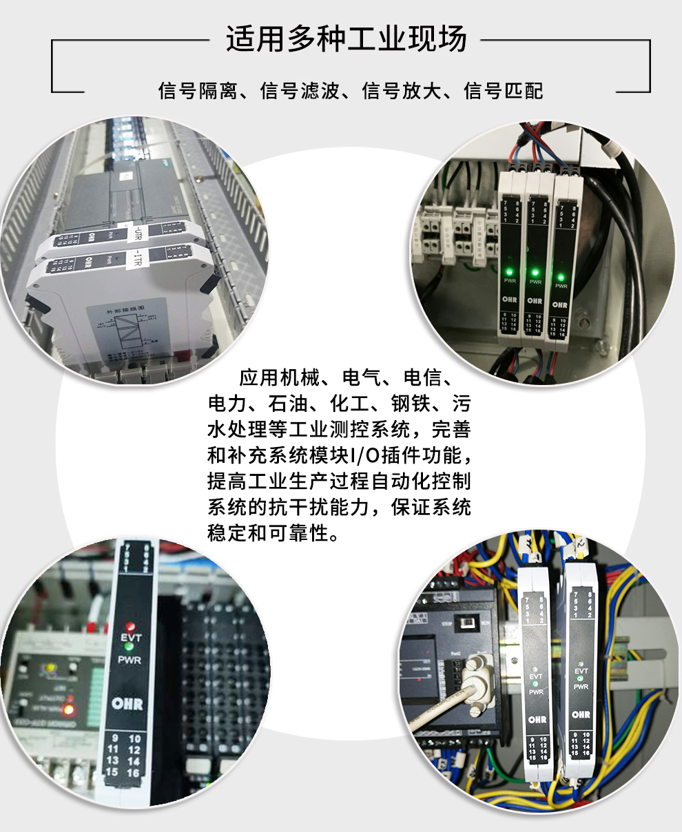 配電器給二、三線制變送器提供隔離的電源電壓,將變送器產(chǎn)生的直流電流信號(hào)經(jīng)過(guò)隔離傳送,轉(zhuǎn)換成所需的信號(hào)給其它儀表??梢耘c單元組合儀表及DCS、PLC等系統(tǒng)配套使用,給予現(xiàn)場(chǎng)儀表信號(hào)隔離、信號(hào)轉(zhuǎn)換、信號(hào)分配、信號(hào)處理等,從而提高工業(yè)生產(chǎn)過(guò)程自動(dòng)控制系統(tǒng)的抗干擾能力,保證系統(tǒng)的穩(wěn)定性和可靠性。